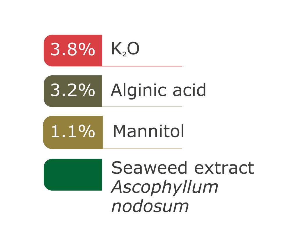 Its natural bioactive compounds content enhances plant resistance to adverse conditions, including water and temperature stress, as well as high-demand developmental stage transitions, while potassium improves sugar tranlocation.