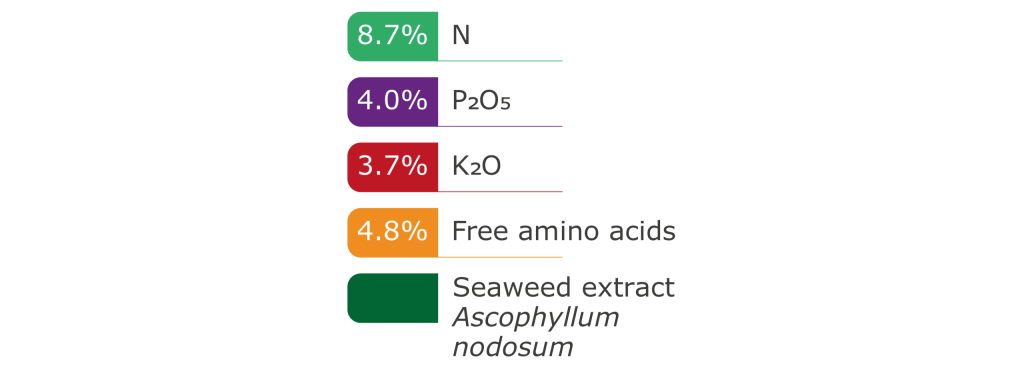 NPK fertiliser with a complete cocktail of chelated micronutrients that includes Ascophyllum nodosum and high quality amino acids in its formulation. This perfect symbiosis generates multiple benefits for the crop: