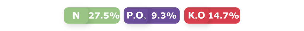 Its combination of nitrogen forms ensures a vigorous vegetative development and efficient nutrient uptake. Phosphorus promotes root activity and energy metabolism, while potassium contributes to balanced growth and stress tolerance.